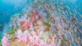 ヒメエダミドリイシの上には様々な魚が群れています。これは群れていたスズメダイですね。ところどころイバラカンザシ(英名:クリスマスツリーワーム)が生息していて綺麗です(でも、これがゴカイの仲間というのはできれば知りたくなかった)。